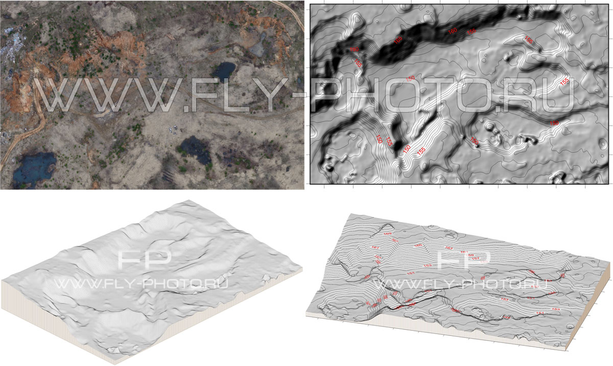 Цифровое трёхмерное моделирование рельефа на основе аэрофотоснимков позволяет провести полную визуализацию интересующей вас территории. Кроме того предлагаемые нами 3D модели местности являются уникальными в своем роде, а благодаря интерактивности просмотра, не требующего специального программного обеспечения, являются удобным инструментом для рекламы и продажи объектов недвижимости. Интерактивность 3-х мерной аэрофотосъемки - удобна в пространственном анализе. Мы используем беспилотники для аэрофотосъемки и это оправдано, особенно на небольших площадях и в результатеклиент получает полный ассортимент готовых материалов, в том числе 3D модель рельефа. Для наибольшей детализации аэрофотосъемку точечных объектов необходимо проводить как в надир, так и с отличием от надира, а БПЛА в этом случае наиболее оптимален, кроме того на больших площадных объектах требуется проводить перекрестное фотографирование и с финансовой точки зрения беспилотник в аэрофотосъемке наиболее выгоден. В качестве результатов 3D аэрофотосъемки рельефа возможны следующие данные: