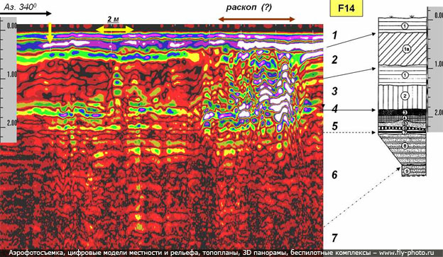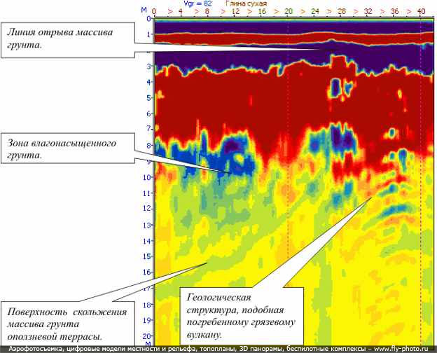 Проведение георадарного обследования позволяет получить картину толщи массива, например, грунта, где данные представляют подобие рентгена и по насыщенности окраса можно судить об увлажненности, наличии мерзлых грунтов, промывов, полостей, формирование оползневых процессов и провалов, если же обследования проводить на инженерных сооружениях, то данные обнаруживают трещины и неоднородности структуры. Георадиолакационное зондирование дает возможность получить: • определение влажности и структуры грунта; • поиск подземных коммуникаций и инженерных сооружений, в том числе и археологических; • выявление глубин залегания подземных вод и полостей, определение глубин промерзания; • получение комплексных радиофизических и гидрогеологических данных для включения в общую картину мониторинга района; • использовать комплексную радиофизическую и гидрогеологическую информацию при интерпретации результатов мониторинга; • изучение опасных геологических процессов и формирование мероприятий по их предотвращению; • определение толщи грунтов, подразделяющихся по характеристикам и полезности, в том числе изучение процессов выторфовки и оценка запасов; • поиск подземных захоронений, в том числе вредных и токсичных; • определение геометрических характеристик и состояния фундаментов, подземных конструкций и т.д.; • подготовка площадок к дальнейшим буровым работам; • выявление зон повышенной трещиноватости, что актуально при поиске полезных ископаемых и определении монолитности массива, служит вспомогательным в геофизических исследованиях и является опорным; • определение простирания и геометрии слоев искусственных сооружений, например дорожной одежды часто применяется при контроле качества строительных работ и является основным инструментом неразрущающего контроля в данных областях; • обследование донных отложение рек и озер в том числе под слоем ила. Георадар GPR